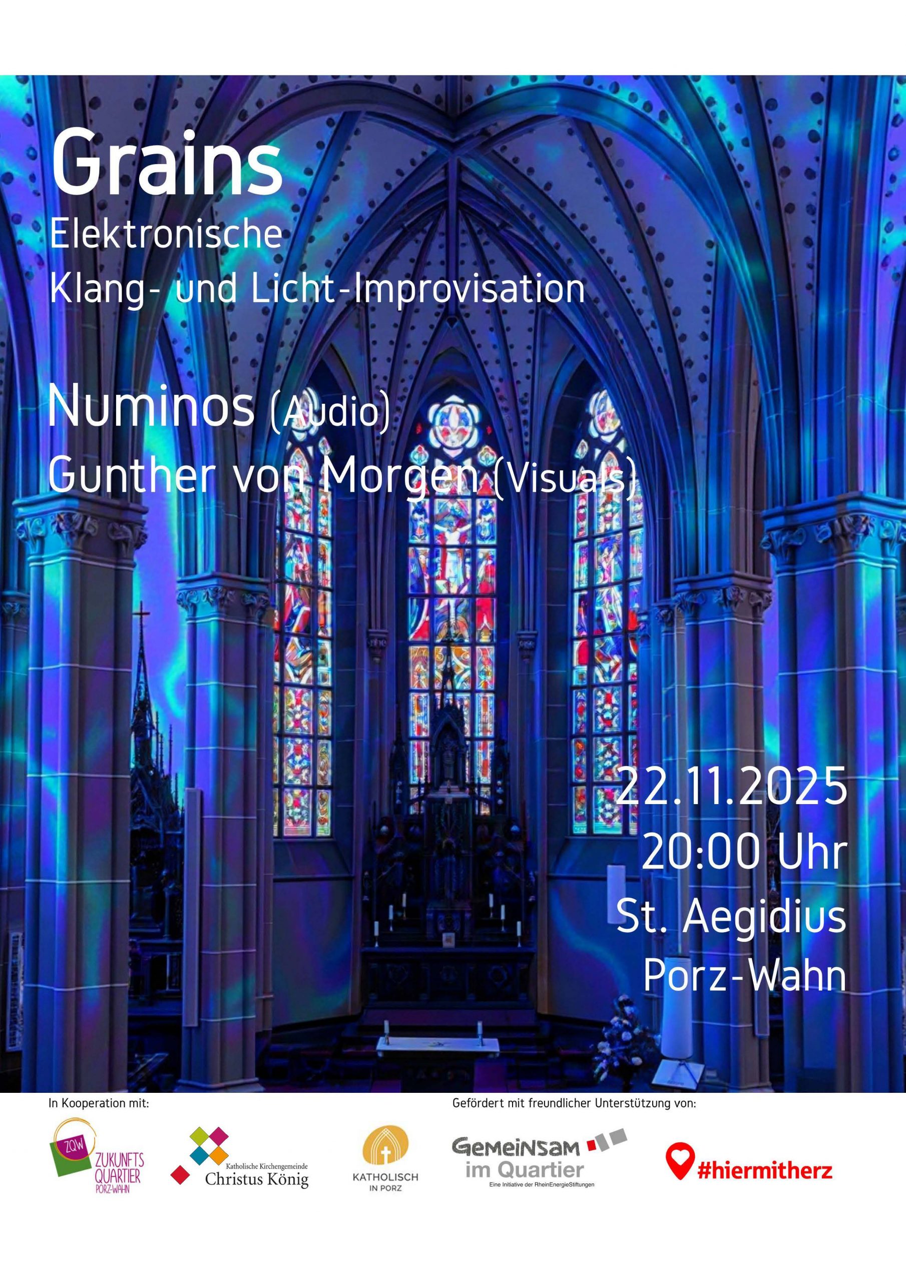 An diesem Abend treten Numinos, ein Pionier im Bereich der elektronischen Klangkunst und Folkwang-Dozent für Elektronische Musik, und der Lichtkünstler Gunther von Morgen in einen konzertanten, künstlerischen Dialog. Inmitten der optisch und akustisch beeindruckenden Pfarrkirche St. Aegidius begeben sich die beiden Künstler auf eine vielschichtige Licht- und Klangreise, bei der moderne digitale Medien mit dem ehrwürdigen Sakralbau interagieren. Dabei verleiht die besondere Akustik der neugotischen Kirche mit einer Nachhallzeit von weit über sieben Sekunden jedem Klang eine außerweltliche Anmutung, während das Lichtspiel die Architektur gleichzeitig in Szene setzt und mystisch verfremdet. Der Kirchenraum, der immer schon ein Ort des Innehaltens und der Stille war, wird so zu einem modernen Einladung, sich vom Alltäglichen zu lösen.